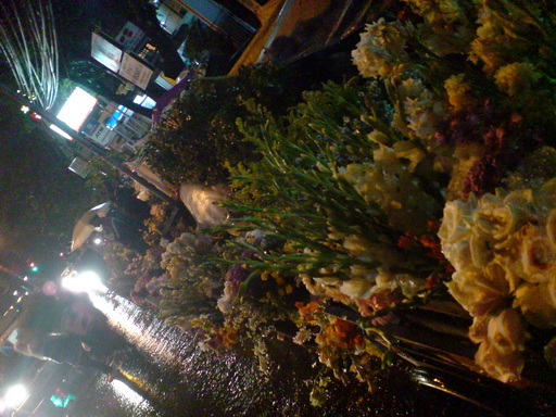 Aku yang tertarik sedikit berkeliling, menunda makan malamku dan bertanya-tanya. Ternyata, memang ini sudah jadi tradisi di berbagai titik di Bandung. Pada malam lebaran, para florist itu bersekongkol untuk jualan akbar salah satunya di areal Simpang Dago ini, hanya pada malam lebaran. Biasanya sampai jam 10 atau 12 malam, dan tidak akan ada lagi sampai lebaran tahun depan. Tradisi ini sudah bertahun-tahun meskipun tahun kemarin tidak ada karena hujannya terlalu lebat untuk mengusir baik penjual maupun pengunjung.
