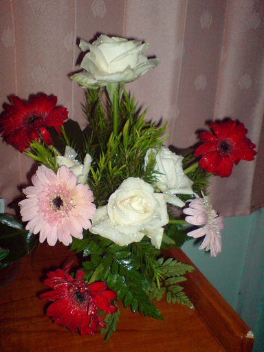 Sedikit berselang aku iseng kembali ke tempat aku ngobrol dengan florist pertama yang sepi pengunjung. Mawarnya per tangkainya lebih gress, tidak hanya pink polos tapi berbercak indah. Harganya Rp.5000 per dua tangkai pula, menyesallah daku. Di sana juga ada rangkaian per pot yang cukup menarikku. Harga 20.000 sepakat digoyang menjadi 15.000 (masih lebih mahal dari tawaran ibu tadi) dan jadilah aku pulang membawa 3 tangkai kembang, 1 pot bunga, payung, dan handphone untuk foto-foto di tanganku. Sayang hanya bertahan 2 minggu paling lama, padahal aku ingin memeliharanya dan merias ruang agar lebih ramah mata lebih lama. Terlebih lagi supaya bisa dipamerkan ke kawan-kawan dan teman seperkosan kelak, oleh-oleh melewati malam lebaran di Bandung.