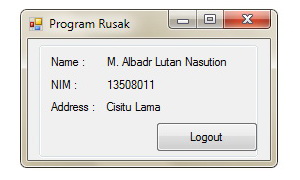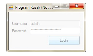 Program diatas adalah program kecil dan sangat sederhana. Tugasnya untuk meminta password admin. Dengan validasi username dan password oleh program ini, program dapat memanggil program utama sebagai contoh idviewer, organizer, dll. Jika username password tidak tepat, program tidak akan bereaksi.