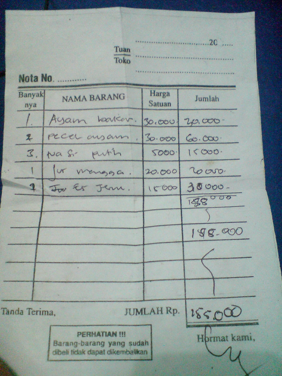 Karena lapar, kami pun memutuskan untuk mendatangi salah satu warung makan yang ada di sepanjang jalan jalur dua depan arena PRJ. Kami tidak tahu, bahwa ini adalah keputusan paling menyesalkan dalam perjalananan ini. Warung ini memang mirip dengan warung gerobak pinggir jalan dekat kosan, di balubur, atau ayam pinggir jalan. Akan tetapi, harganya itu. Sesaat setelah kami memesan ayam bakar, ibu pengunjung lain disebelah marah-marah ke penjualnya. Sate yang beliau makan dihargai Rp5000 rupiah per tusuk. Sup dihargai Rp30.000 lebih. Belum lagi jus dan kawan-kawan. Ditotal-total, ibu itu menghabiskan Rp250.000 sekali duduk dengan suaminya di warung itu.