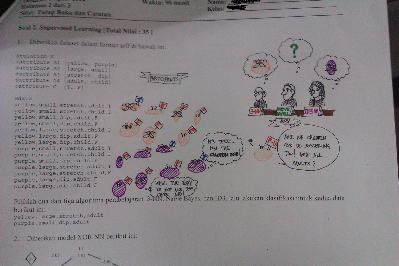 Tapi bagus juga tuh komiknya. Lumayan mengilustrasikan si soalnya (tentang klasifikasi data pake knn, id3, bayes). Pake warna lagi gambarnya, niat banget bawa pulpen warna pas ujian. Hehe…