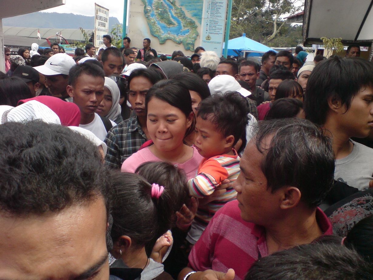 Setelah lelah berkeliling dan menghabiskan uang untuk membeli cinderamata, sekitar pukul tiga sore kami pun memutuskan untuk kembali ke daratan Sumatera. Dengan menyisiri jalan yang kami lalui tadi lewat pasar, sampailah kami di pelabuhan tampat kami mendarat. Pelabuhannya memang sama tetapi suasananya sedikit berbeda. Jumlah manusia, sangat berbeda. Seluruh pinggiran pelabuhan sampai pinggir air dipenuhi wisatawan yang ingin menyeberang balik ke Parapat. Ramainya waktu itu bukan main sampai para pengunjung saling berdesakan.