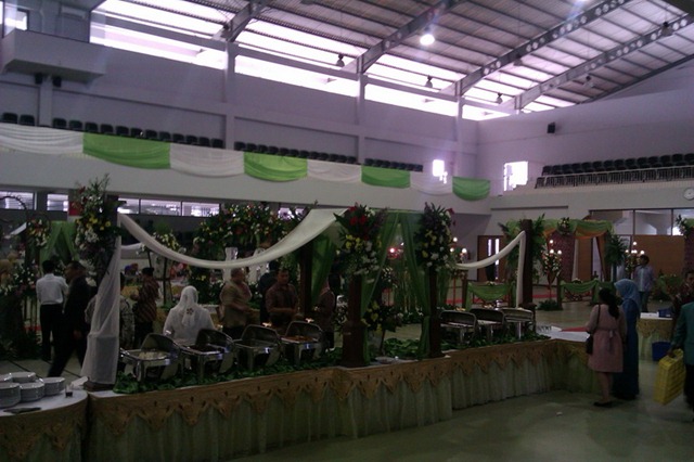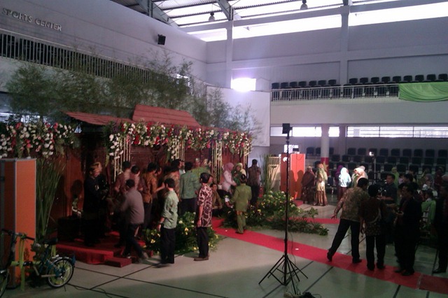 Ya, resepsi pernikahan ini tampak cukup megah. Akan tetapi, jika diperhatikan sebenarnya komponen-komponen penghias acara cukup sederhana. Beberapa kain hanya ditempelkan di tribun atas gedung. Layar putih untuk cerita kartun sejarah cinta masing-masing hanyalah layar proyektor biasa. Hanya ada meja makanan seadanya meskipun tampak memanjang melintasi tengah ruangan. Pelaminan jelas bukan panggung super besar berhias emas selayaknya pernikahan putra-putri kerajaan adat. Iringan organ tunggal yang biasa ada di acara seperti ini diganti oleh dendungan lagu nasyid yang diputar melalui speaker gedung. Panitia pun tidak perlu menyediakan kursi untuk pengunjung karena di kanan kiri sudah ada kursi tribun yang siap diduduki. Kondisi gedung olahraga dengan kesan yang mewah serta ukuran yang pas dan hiasan yang mengelilingi acara resepsi membuat acara ini tampak megah walaupun cukup sederhana.