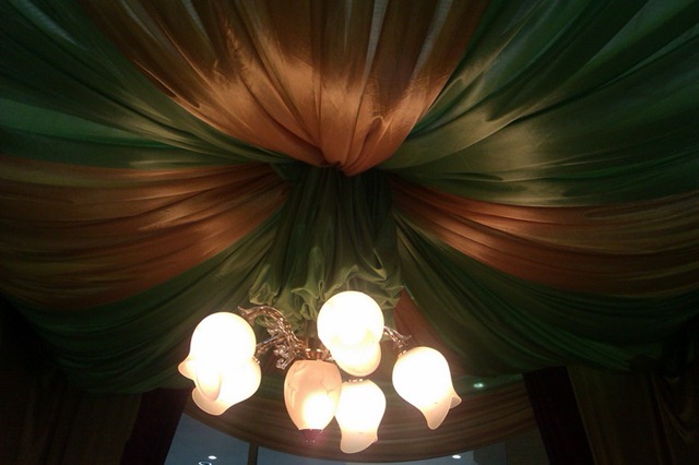 Setelah mengisi buku tamu, kami masuk ke ruangan utama. Kami langsung disambut oleh hiasan kain berwarna-warni di dekat pintu dan dinding-dinding gedung. Di ruangan utama terdapat dua baris meja berisi makanan prasmanan memanjang mengikuti panjang ruangan. Di tengah terdapat meja terdapat blok es besar dengan hidangan pencuci mulut di sekitarnya. Hiasan di meja prasmanan ini menambah kesan mewar dan bagus dari acara resepsi.