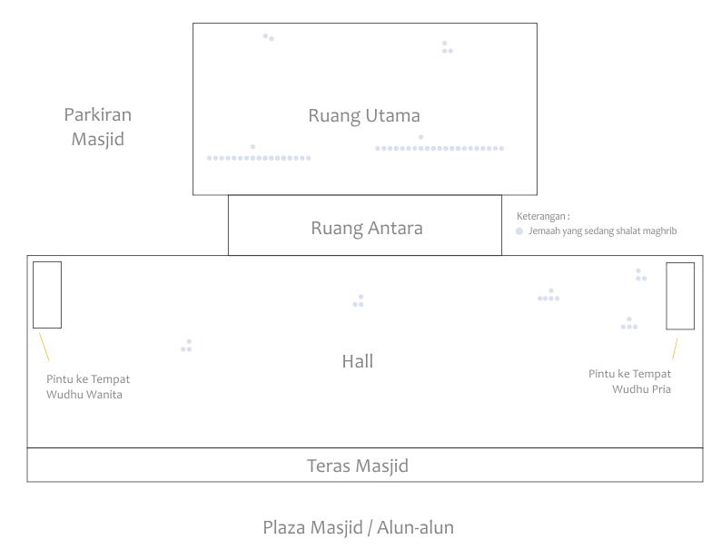 Tidak usah membahas tempat wudhu yang becek dan muncul cacing dari sela-sela kemarik di selokan lah ya. Setelah wudhu saya langsung ke ruang utama dengan harapan ada jemaah yang mendingan. Ternyata di sana sama saja. Terdapat dua jemaah besar yang berdampingan kiri-kanan. Imamnya dua, masing-masing. Tiap jemaah satu baris. Ini jemaah yang mana yang begitu sombongnya tidak mau bergabung ke barisan yang sudah ada duluan dan membuat barisan baru? Entahlah. Anehnya lagi kedua barisan ini berada di posisi belakang ruang utama, kenapa tidak di depan. Di depan sana malah ada beberapa jemaah kecil (dua-tiga orang) juga. Haduh biyung. Terpaksa, akhirnya saya pilih salah satu jemaah besar di belakang yang kira-kira lebih dahulu shalatnya. Mau menunggu seluruh jemaah selesai dan membuat baru rasanya mustahil di masjid ini. Mungkin shalat sendiri-sendiri lebih baik dari shalat berjemaah seperti ini.