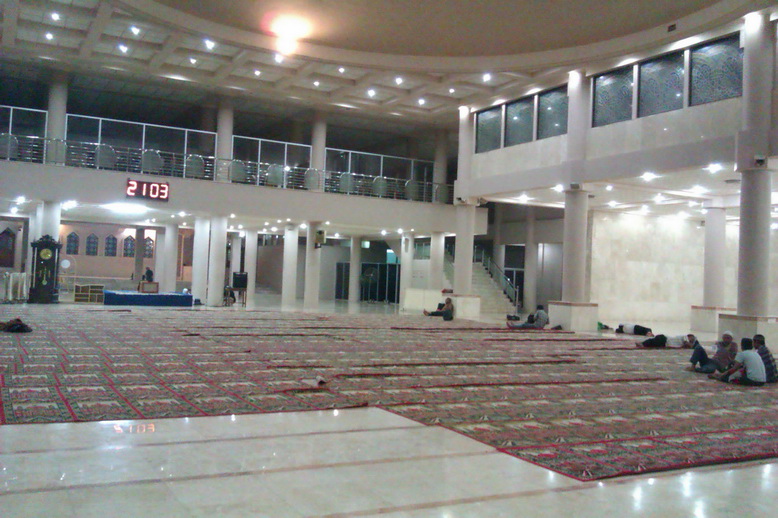 Setelah rangkaian shalat tarawih dan witir selesai, tidak ada pemberitahuan agenda iktikaf apa pun. Pikir kami mungkin karena ini hari ke empat jadi tidak diberitahukan lagi. Pukul 21.00 kurang, orang yang tinggal di ruang utama masjid tinggal segelintir, mungkin tidak lebih dari 20 orang. Dan kebanyakan dari mereka sudah berbaring. Biasanya setelah shalat tawarih kan banyak yang tilawah tuh, ini kok cuma dua-tiga orang. Suara tilawah disini menggaung ke ruangan saking sepinya malan itu. Harus mengatur napas dengan baik atau seluruh ruangan masjid bisa mendengar suara ceking Anda.