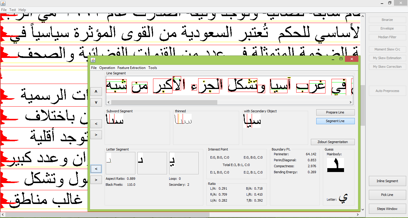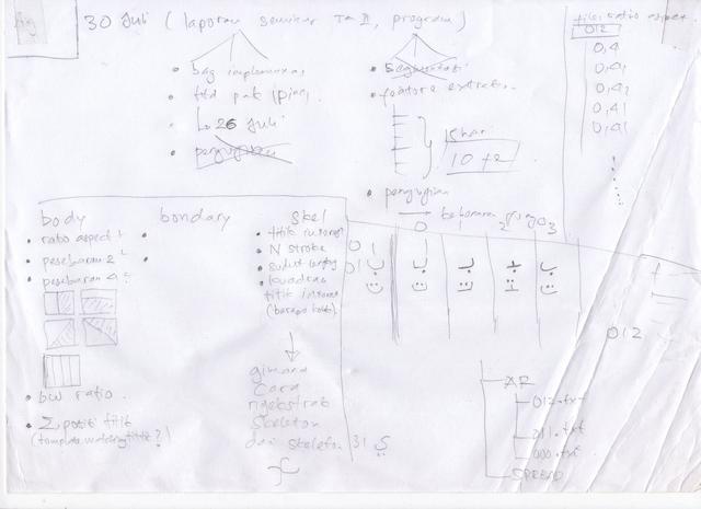 Sampai seminar, klasifikasi huruf belum dibuat. Jadi dari lima tahap pengenalan huruf Arab (praolah -> penipisan -> segmentasi -> ekstraksi fitur -> klasifikasi), yang paling akhir belum.