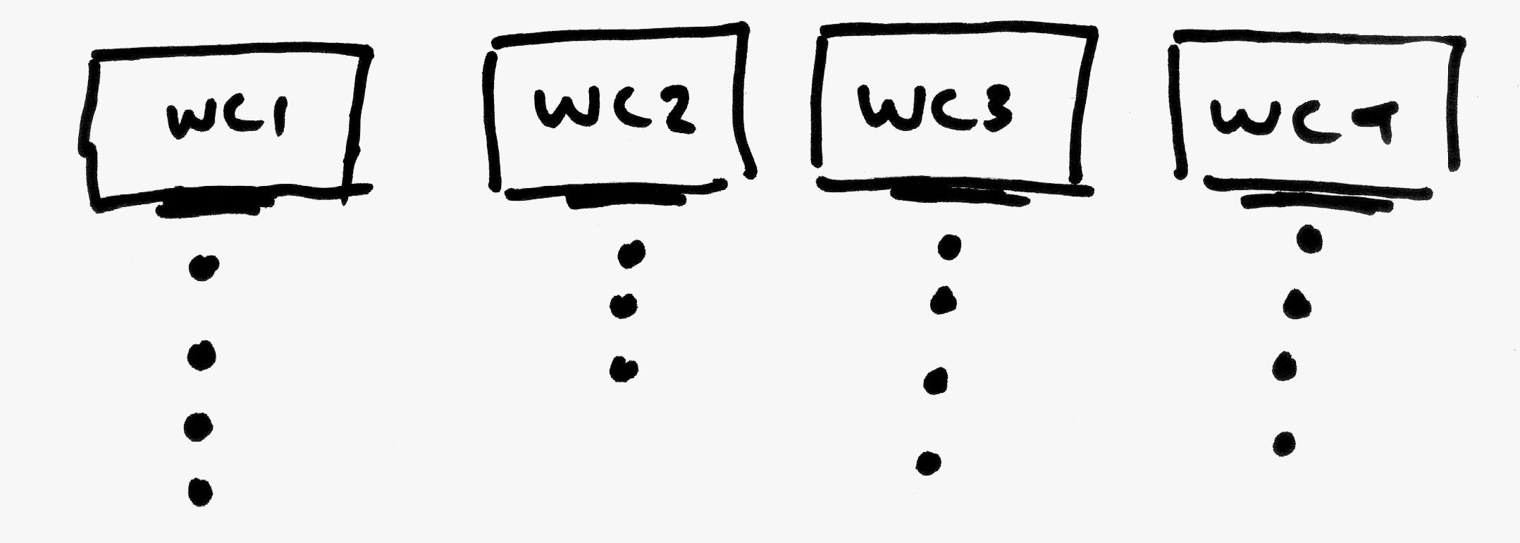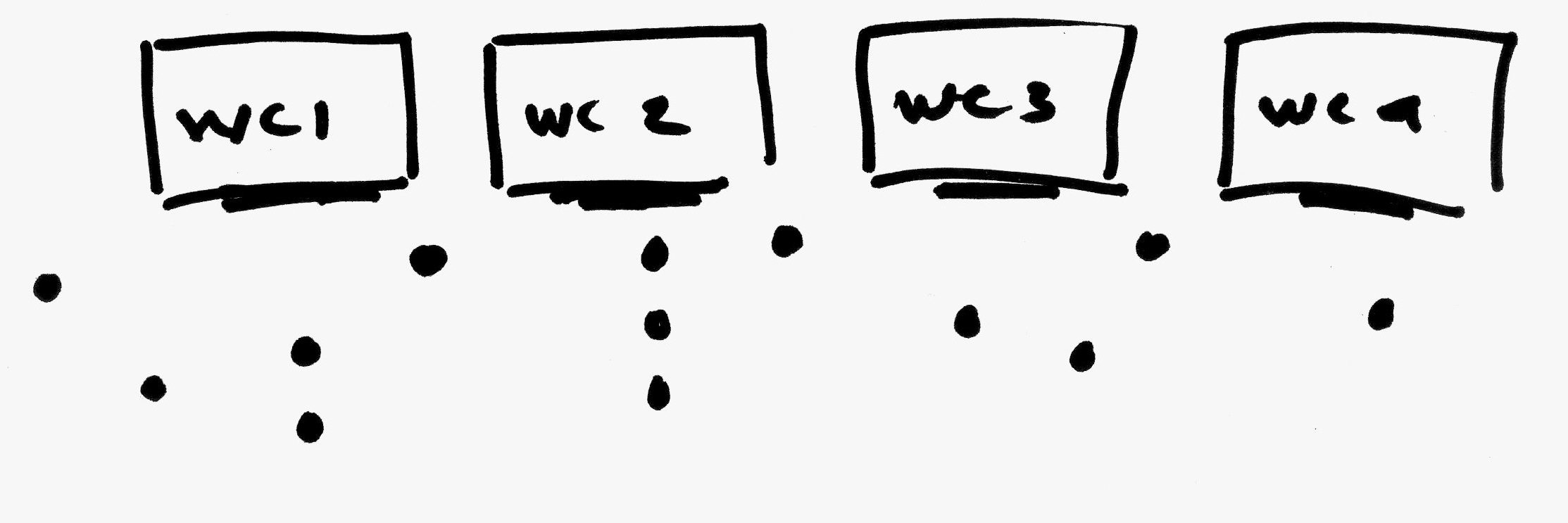 Kalau antriannya paralel gini lebih rapi dan nggak ada konflik deh. Tapi tetep saja masalah yang pertama tidak terpecahkan. Masalah yang satu penghuni ternyata jauh lebih lama dan antrian menjadi tidak adil karena yang datang duluan tidak masuk duluan.