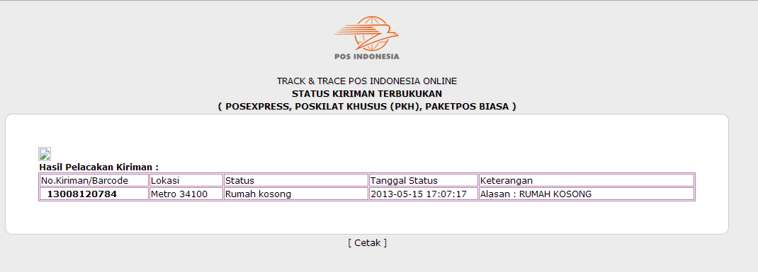 Esok paginya, Rabu, saya cek lagi karena ternyata selasa itu belum sampai juga ke rumah tujuan.  Yang tampil masih satu entri, yakni persis yg tertera pada gambar di bawah ini.