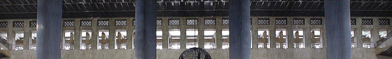 Dari ruang utama masjid, melihat ke dinding depan bagian atas sekali terdapat persegi-persegi yg sepertinya berfungsi sebagai ventilasi. Pada saat saya kesana, ventilasi tersebut sudah ditutup oleh stainless steel berkasa, seperti yg tampak pada gambar di atas. Nah objek pembicaraan konstipasi kita kali ini adalah kemunculan sebuah lambang yg dibingkai oleh lubang ventilasi tersebut.