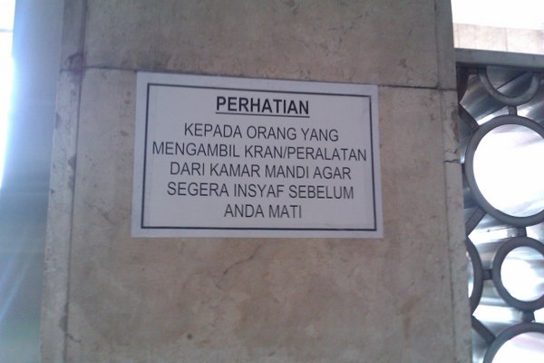 Setelah memoto-moto sungai hitam di sekitar gerbang utara tanpa beralas kaki, saya masuk lagi ke Istiqlal dan menyusuri tempat wudhu ke sebelah barat. Sepi banget nggak ada orang. Seperti maling saja saya lewat sana. Agak takut juga ditegor satpam. Dan ngomong-ngomong soal maling, ada tempelan lucu loh yg saya temukan di tempat wudhu sana.