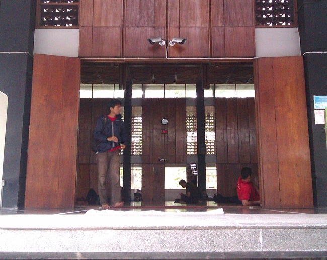 Yang saya sesalkan dari installasi CCTV Salman yang baru ini adalah posisinya tidak menangkap gambar sesuai jalur yang lazim di lewati orang. Misalnya gambar di bawah yang diambil langsung dari lorong utama tempat ikhwan masuk ke ruang utama. CCTV tidak menghadap depan lorong! Jadi percuma deh diletakkan disana, toh nggak menangkap gambar orang masuk.