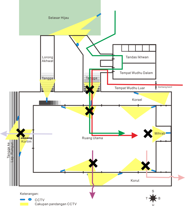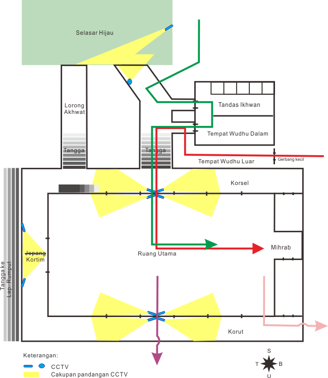 Kemudian, yang saya salah gambar juga adalah arah CCTV pada lorong utama ikhwan. Arahnya bukan ke dalam tapi ke luar, ke arah selasar hijau. Dan di selasar hijau ini juga terdapat CCTV yang mengarah ke tempat penyimpanan sepatu.