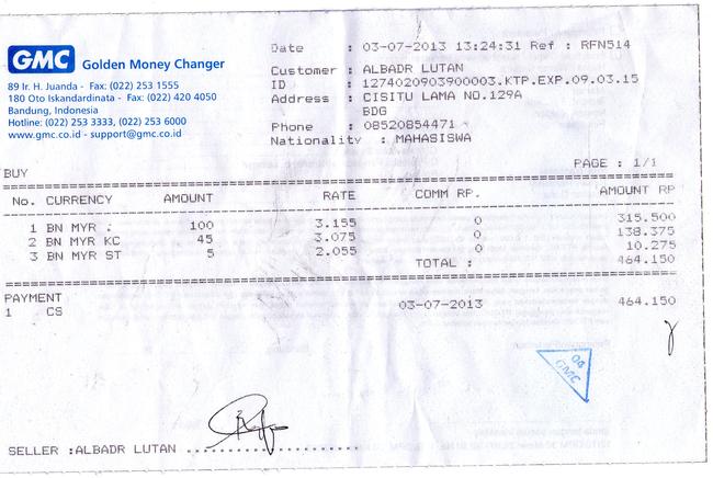 Kemarin dari pengalaman kemaren, saya menukar Rp 3.100,- ke RM 1 di Bandung. Ini kurs beli ringgit di Bandung. Dan saya menukar Rp3.400,- dengan RM 1 di Kuala Lumpur. Ini kurs beli ringgit di KL.