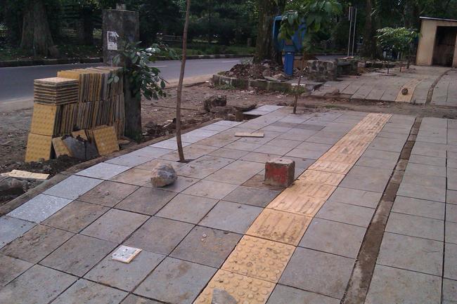 Oh ya, ngomong-ngomong soal trotoar yang baru dibangun. Luas banget ya? Keren, rapih (masih belum selesai sih pembangunannya). Sekarang tebak-tebakan nih… Itukan di trotoar yg baru ada jalur kuning di tengah? Ada yang tahu nggak itu maksudnya apa.