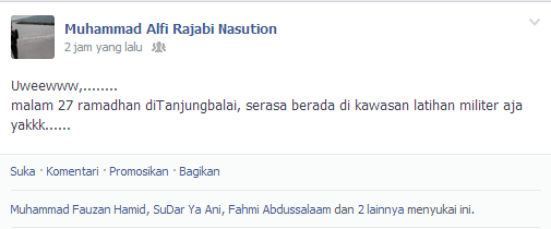 *) Keluarga saya bukan termasuk keluarga yg cukup punya uang untuk dihamburkan dengan membakar merecon. Adik saya saja (sudah SMA sekarang) sampe komentar “pas ayang kecil nggak pernah dibeliin merecon ma, ma..” Saya berkomentar, “Terus sekarang?”. Adik saya menjawab “Halah, kecil aja nggak dibeliin. Apalagi udah besar…”. Kami pun tertawa…