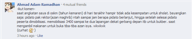 Kalau ada yang tersinggung ya bagus, berarti harus lebih ditingkatkan kinerja siapa pun itu yang tersinggung. Masih ada kesempatan kok, OSKM masih seminggu ini. Salah satu yang berkomentar di FB saya curhat kalau tahun kemaren sempat miss satu kali shalat saat OSKM. Nah, berarti masalah shalat ini isu yang penting juga kan. Walaupun bukan niat saya juga mengangkatnya.