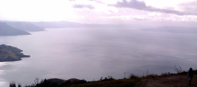 Pemandangan danau toba dari sini? Di pagi hari ini? Di mana matahari masih rendah, udara masih segar, dan masih sepi manusia. Superb. Cantik nian. Cahaya matahari memantul di permukaan air danai. Warna gradasi hijau yang berbeda-beda pada bukit. Hijau pada sawah dan permukiman di bawah. Desa nelayan di bawah. Ah, menakjubkan. Memang harus dilihat dengan mata kepala sendiri ini. Foto sangat tidak merepresentasikan!