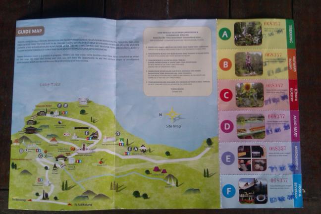 Karena masih pagi-pagi buta (pukul 7 lewat), suasana situs saat itu sepi sekali. Mantap sekali rasanya berlenggang disana tanpa harus diganggu wisatawan lain. Jalan dari gerbang depan ke area pusat dalam jaraknya sekitar 1-2 kilometer. Jalan tersebut diisi oleh hutan pinus. Oh ya, berikut peta Taman Simalem yang saya foto dari brosur “tiket”. Kupon-kupon yang saya sebut tadi juga ada di sisi kanan foto.