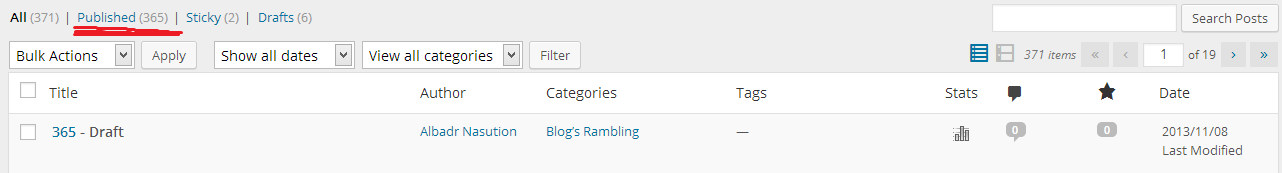 Well, bukan prestasi yang mengagumkan memang. Malah bisa dibilang malas -.-, sesuai yang dibilang teman saya Garin, masa sudah dua tahun baru 333 pos, lah ini hampir lima tahun baru 365. Huh. Harus lebih giat lagi nih mendorong pemilikku menulis. Dan harus diingatkan terus, jangan panjang-panjang artikelnya.