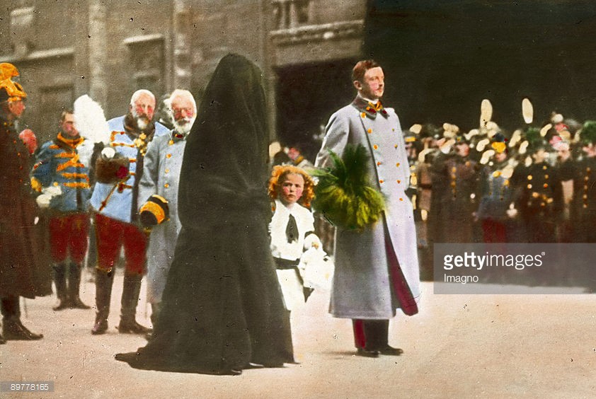 Das Begr‰bnis von Kaiser Franz Joseph I. Kaiser Karl I mit Kaiserin Zita und Kronprinz Otto beim Trauerzug vor dem Stephansdom. Handkoloriertes Glasdiapositiv. 30. November 1916. Emperor Franz Joseph¥s funeral. Emperor Karl I., Empress Zita, crown prince Otto at the funeral procession in front of the St. Stephen’s Cathedral. Hand-colored lantern slide. November 30th 1916.