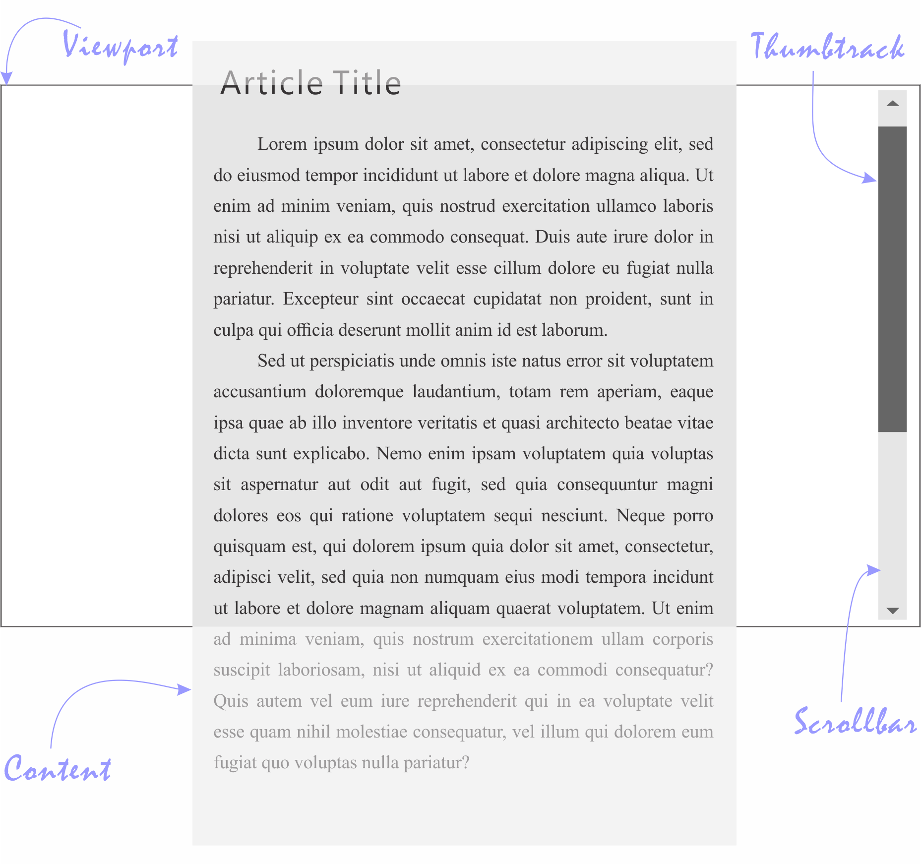 Pertama-tama, perhatikan skema jendela komputer yang umum ditemui berikut ini. Scrolling diperlukan karena content yang dimiliki memiliki besar yang lebih besar dibanding lubang intip alias viewport dari jendela kita.
