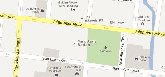 Di pinggir jalan yang tentunya masih termasuk area jalan untuk kendaraan ini, di depan dua wanita berjalan berlenggak-lenggok layaknya foto model. Beberapa kali kami klakson, tetap saja mereka cuek. Sepertinya jalan ini atau setidaknya pinggirannya didanai oleh nenek moyangnya sehingga mereka merasa mereka – pejalan kaki – berhak memakai jalan raya. Meskipun kesal, apa boleh buat. Nenek moyangnya nyumbang sih, jadi saya hanya bisa mencari rengkahan lain untuk melewati mereka. Jalan sebesar ini, dengan ruas yang hanya 40 meteran, berapa menit sudah terbuang. Akhirnya kami sampai pula di belokan terakhir, Jalan Dalem Kaum, menuju parkiran Alun-alun Kota Bandung di depan Masjid Raya Bandung.