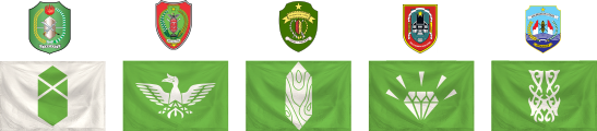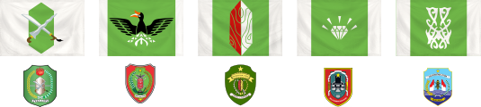Dimulai dari barat, Kalimantan Barat memiliki lambang talawang polos, dengan mandau dan keris menyilang di hadapannya. Kobaran api menyala dalam tungku ada di atasnya. Makna lambang ini bisa dicek di… Wikipedia Lambang Kalimantan Barat.