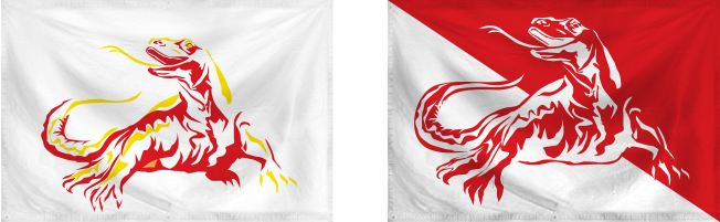 Dengan skema warna dan bentuk lambang seperti di atas, beginilah bentuk benderanya. Mantab. Sangat sesuai sekali kan. Warna merah kuning hitamnya. Bentuk segitiganya juga mengikuti perisai pada Coat of Arms. Posisi bintang berwarna putih. Semuana sinergi dan ngepas.