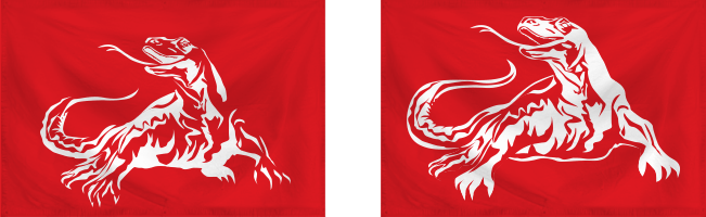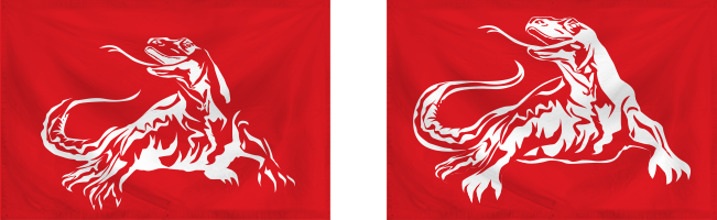Kalau mau dibuat bendera, ya jadi seperti ini. Bayangan shading pada lambang aslinya hitam, saya ganti menjadi warna latar yang disesuaikan, supaya skema warna yg digunakan menjadi lebih sedikit.